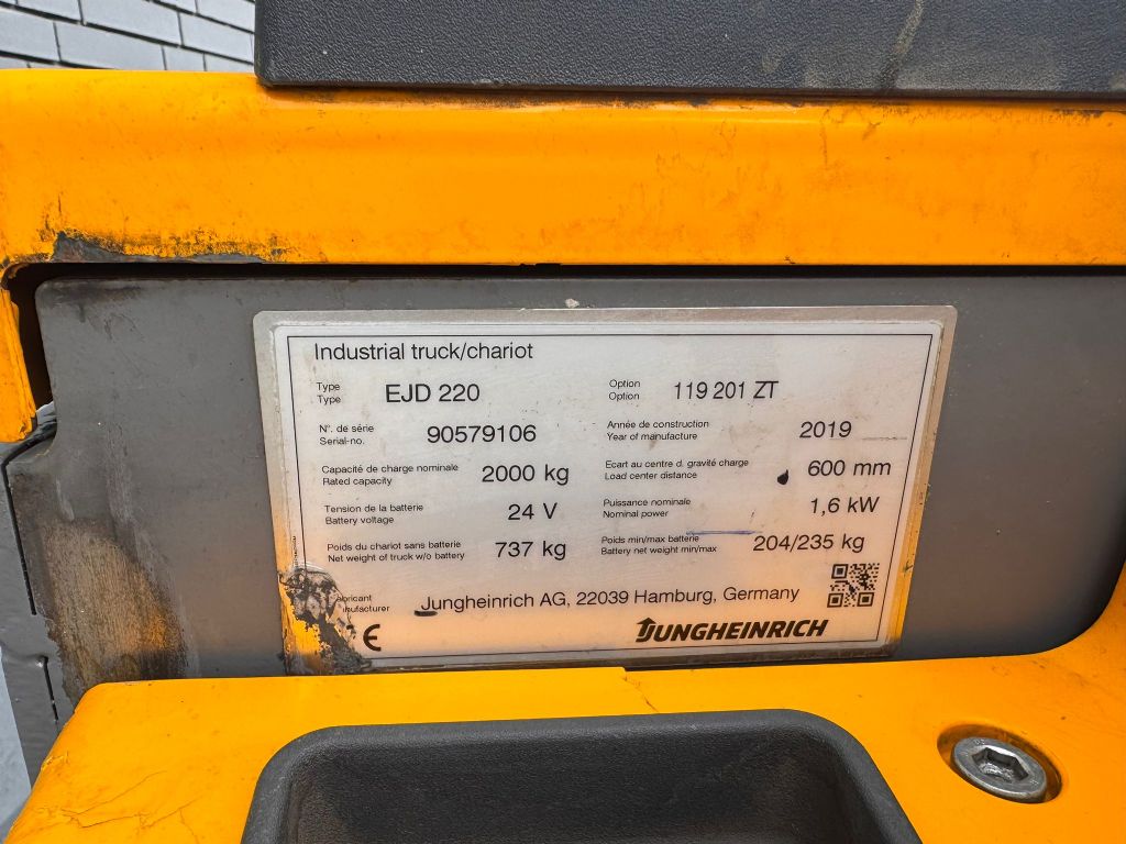 Hersteller: Jungheinrich Typ: EJD 220 Baujahr 2019 Stunden 3887 HH 2,1M Bauart: Hochhubwagen Antriebsart: Elektro Tragkraft: 2000 kg Baujahr: 2019 Stunden: 3887 Zustand: gut |