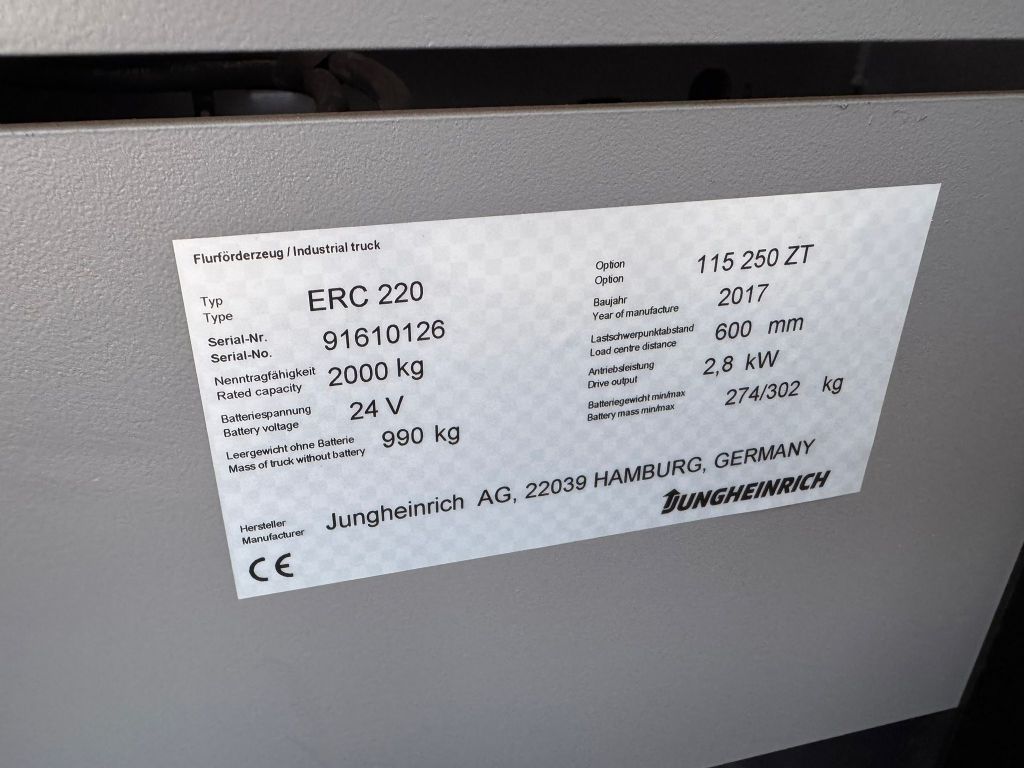 Hersteller: Jungheinrich Typ: ERC 220 Baujahr 2017/ HH 2,5M/ Jungstars***** Bauart: Hochhubwagen Antriebsart: Elektro Tragkraft: 2000 kg Baujahr: 2017 Stunden: 3488 Zustand: Neu |