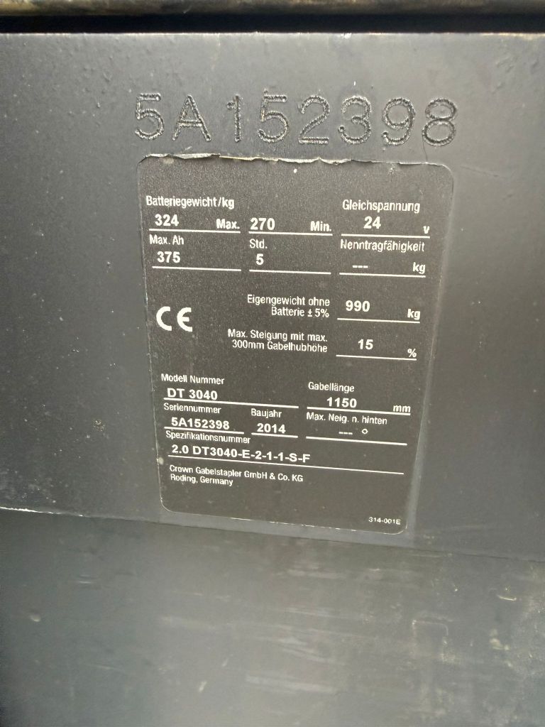Hersteller: Crown Typ: DT 3040 Baujahr 2014/ Stunden 5325 Akku 2022 Bauart: Hochhubwagen Antriebsart: Elektro Tragkraft: 2000 kg Baujahr: 2014 Stunden: 5325 Zustand: gut |
