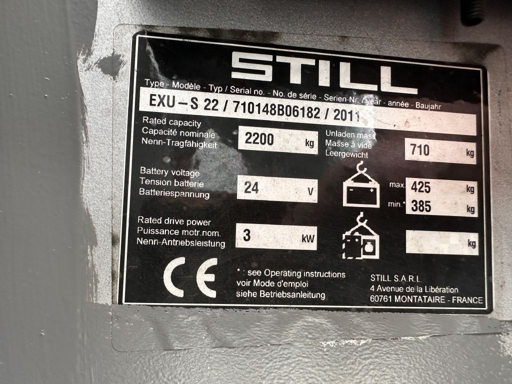 Hersteller: Still Typ: EXU-S 22 Baujahr 2011 / Hubkraft 2200kg Bauart: Hochhubwagen Antriebsart: Elektro Tragkraft: 2200 kg Baujahr: 2011 Stunden: 1234 Zustand: gut |