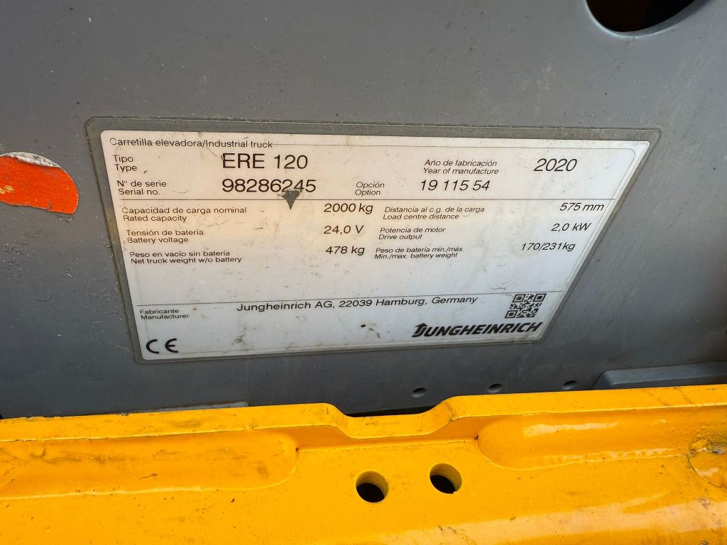 Hersteller: Jungheinrich Typ: ERE 120 Baujahr 2020 Akku 2018 Stunden 3353 Bauart: Niederhubwagen Antriebsart: Elektro Tragkraft: 2000 kg Baujahr: 2020 Stunden: 3353 Zustand: gut |